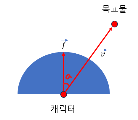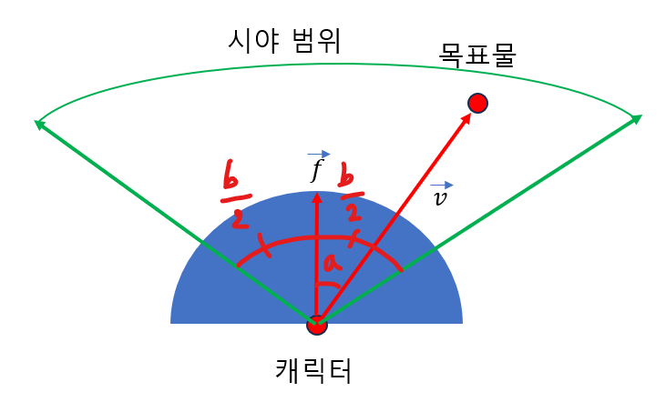 위와 같이 캐릭터의 시선 벡터 f와 캐릭터에서 목표물로 향하는 벡터 v 그리고