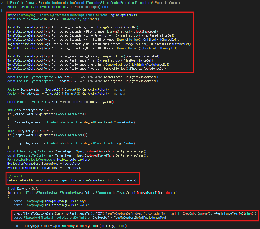 AuraDamageStatics 구조체의 멤버변수를 사용하지 않고, 지역변수를 사용하여 연산에 참고할 Attribute를 지정한다