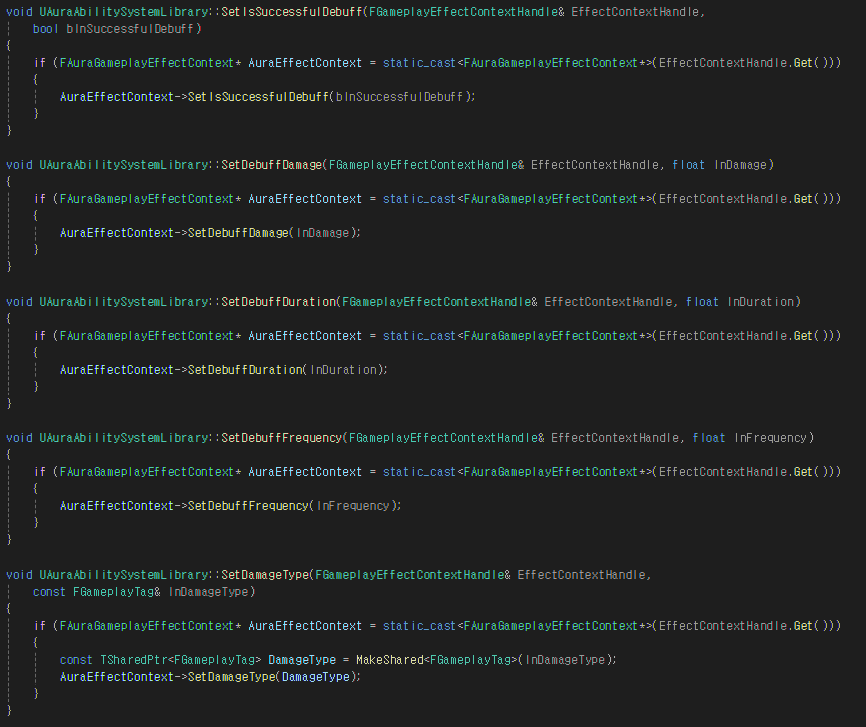 AuraGameplayEffectContext 클래스에 위와 같이 디버프 관련 요소를 가져오거나 설정하는 함수를 추가한다