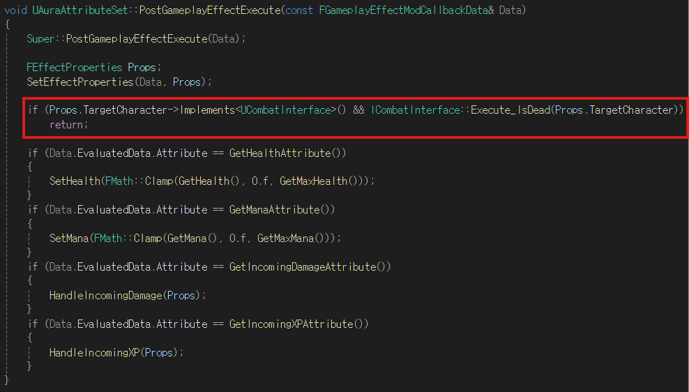 PostGameplayEffectExecute 함수에 로직을 추가하여 적이 쓰러졌다면 GE에 의해 Attribute를 수정하지 않도록 한다
