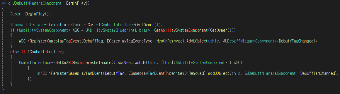 - ASC가 존재하는 경우 : ASC에 DebuffTag가 활성화되는 경우 DebuffTagChanged 함수를 호출하도록 설정