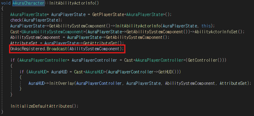 InitAbilityActorInfo 함수에서 OnAscRegistered 델리게이트를 브로드캐스트하는 로직을 추가한다
