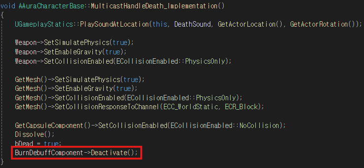 MulticastHandleDeath 함수에서 BurnDebuffComponent의 FX 효과를 중지하는 로직을 추가한다