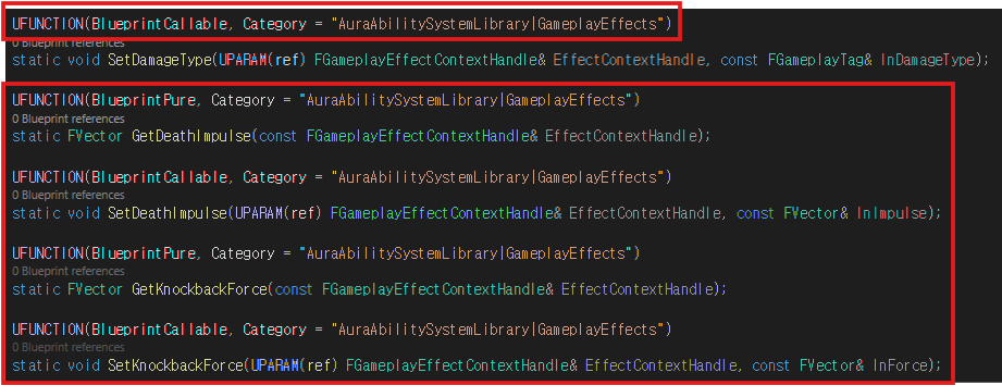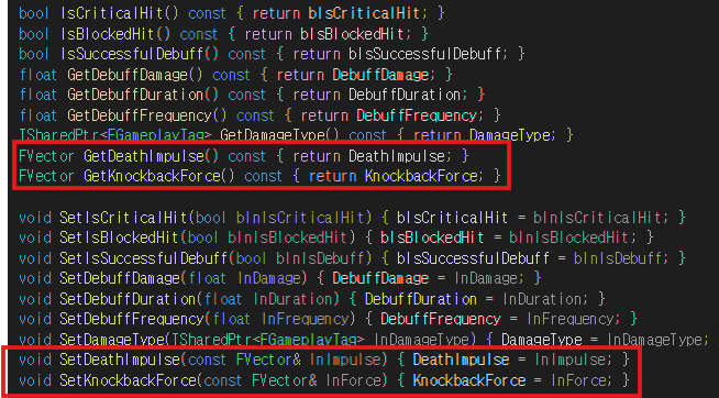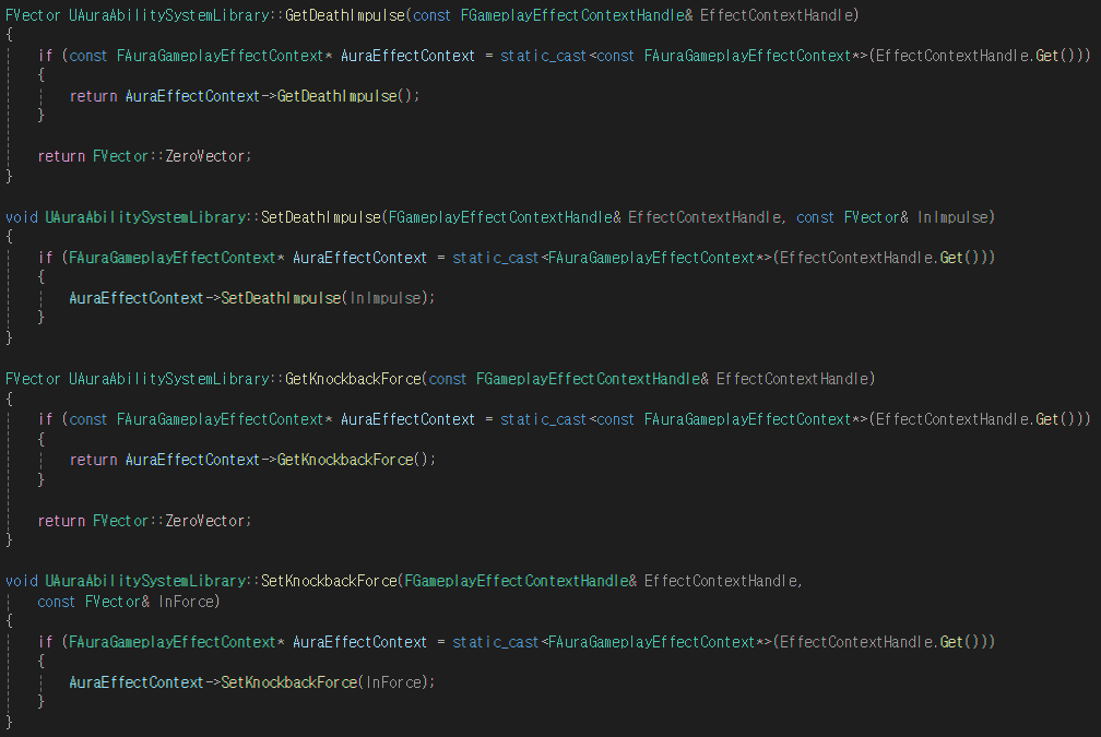 추가한 Getter 함수와 Setter 함수의 로직은 위와 같이 AuraGameplayEffectContext에 접근하여