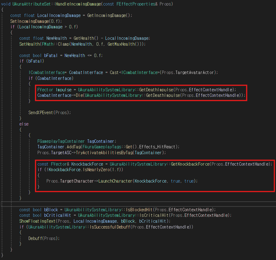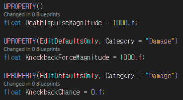 또, 넉백받는 힘이 실질적으로 존재한다면 LaunchCharacter 함수를 호출하여 해당 힘의 방향으로 넉백시킨다