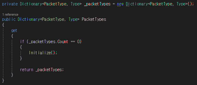 - PacketTypes 프로퍼티 : _packetTypes가 초기화되지 않았다면 Initialize 함수를 호출하고, 아니라면 반환