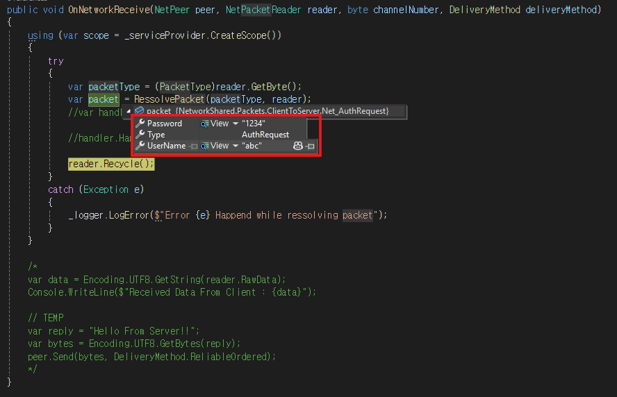 클라이언트로부터 데이터를 받은 경우 호출하는 OnNetworkReceive 함수를 위와 같이 수정한다