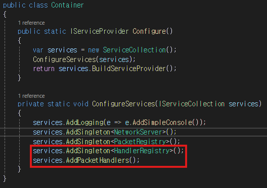 AddPacketHandlers 익스텐선 함수를 갖고 있도록 구성한다