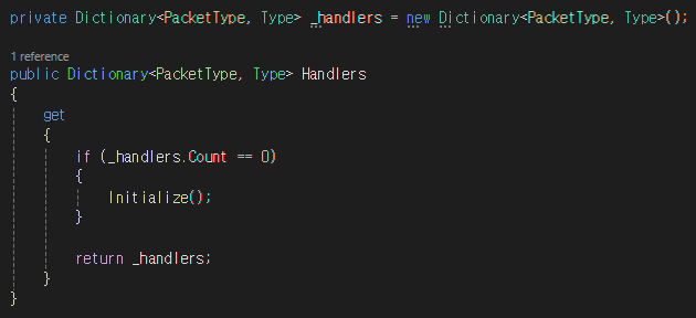 - _handlers 딕셔너리 : 패킷의 타입인 PacketType을 Key로, 핸들러 클래스의 Type을 Value로 저장