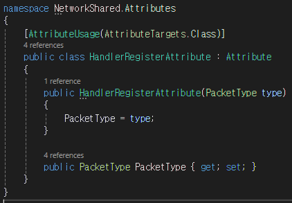 HandlerRegisterAttribute 클래스는 패킷 핸들러마다 무슨 패킷을 핸들링할지 설정한다