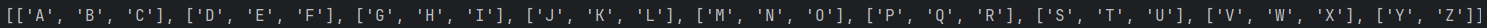 이번에는 리스트를 스플릿, 즉 쪼개어 작은 크기의 새로운 리스트로 만들고만들어진 새로운 리스트들을 다시 리스트에 저장하여 반환하는 예제를 구현해본다예를 들어 다음과 같다x = ['A', 'B', 'C', 'D', 'E', 'F', 'G', 'H', 'I', 'J', 'K', 'L', 'M', 'N', 'O', 'P', 'Q', 'R', 'S', 'T', 'U', 'V', 'W', 'X', 'Y', 'Z'] 위와 같은 배열이 존재하고, 인자로 3을 넣어주면 위와 같이 반환되고, 인자로 5를 넣어주면 위와 같은 형태로 반환되도록 한다 1) enumerate를 사용한 시퀀스 자료구조의 인덱스 / 값 접근def makeListInList(target, num): ret = [] for idx, va..
